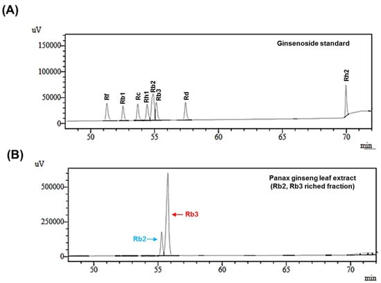 The leaf of Panax ginseng was purchased from Geumsan (Korea). The air-dried powdered leaf (1 kg) of ginseng was extracted with 10 L 70% aqueous ethanol at room temperature and the supernatant was collected by filtration. The ethanol was removed by rotary vacuum evaporator (Heidolph, Schwabach, Germany) and the extract was lyophilized (410 g). The 70% ethanol extract was refluxed with alkaline water (pH 2.5–3.5) for 12 h at 60 °C. The filtrate was partitioned with n-butanol (1:1, 3 times). The dried n-butanol fraction (55 g) was subjected to Diaion HP-20 column. The column was eluted with 30% ethanol first, followed by 100% ethanol, and the eluent was collected and concentrated. The dried HP column fraction (38.5 g) was subjected to open liquid chromatography (Silica-gel, 50 × 600 mm) and eluted with Ethyl acetate-Ethanol (20:1, 10:2, 1:9) to afford 3 fractions (F1–F3). The silica-gel fraction 2–3 was isolated by preparative reversed-phase HPLC (Luna, 250 × 30.00 mm; 5 μm particle size; 15 mL/min; UV detection at 200 nm) eluted with ACN/H2O gradient system, which was shown by HPLC to contain 70% total ginsenoside. This novel purified extract is obtained only with food-grade solvent (i.e., water and ethanol—it has been Ecocert validated) and is then purified by chromatography. The final result is a standardized extract containing two main ginsenosides (over 65%) of the extract in weight. The extract was characterized by a high-performance liquid chromatography (HPLC) method for the determination of ginsenoside Rb3 and Rb2.