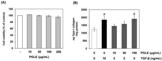 Effects of PGLE on collagen synthesis in human dermal fibroblast. Human dermal fibroblasts were cultured in 24-well plates. Human dermal fibroblasts were treated with or without transforming growth factor-β (TGF-β) and/or PGLE at the indicated concentrations for 48 h at 37 °C. (A) Cell viability was measured by MTT assay; (B) The culture supernatants were harvested and measured with a sandwich immunoassay kit. Data are mean ± standard deviation. # p < 0.01 compared with the vehicle-treated group (n = 3). The results were confirmed by five independent experiments.