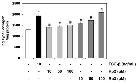 Effects of two main ginsenosides, Rb2 and Rb3, on collagen synthesis in human dermal fibroblasts. Human dermal fibroblasts were cultured in 24-well plates. Human dermal fibroblasts were treated with or without TGF-β and/or ginsenosides (Rb2, Rb3) at the indicated concentrations for 48 h at 37 °C. The culture supernatants were harvested and measured with a sandwich immunoassay kit. Data are mean ± standard deviation. # p < 0.01 compared with the vehicle-treated group (n = 3). The results were confirmed by five independent experiments.