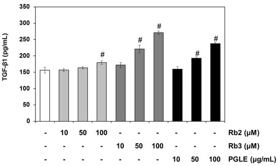 Effects of PGLE and its two main ginsenosides, Rb2 and Rb3, on TGF-β production in human dermal fibroblast. Human dermal fibroblasts were cultured in 24-well plates. Human dermal fibroblasts were treated with or without PGLE and/or ginsenosides (Rb2, Rb3) at the indicated concentrations for 48 h at 37 °C. The culture supernatants were harvested and measured with a sandwich immunoassay kit. Data are mean ± standard deviation. # p < 0.01 compared with the vehicle-treated group (n = 3). The results were confirmed by five independent experiments.