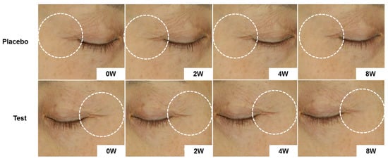 Visual improvement of wrinkles in the crow’s feet area with PGLE application for eight weeks. Skin wrinkle images in crow’s feet following eight consecutive weeks’ application of the test product (Subject No. 15).