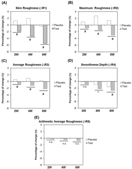 Changes of skin wrinkle parameters in crow’s feet following eight consecutive weeks’ application of test product (Mean ± SEM. * p < 0.05, # p < 0.01 vs. before treatment).
