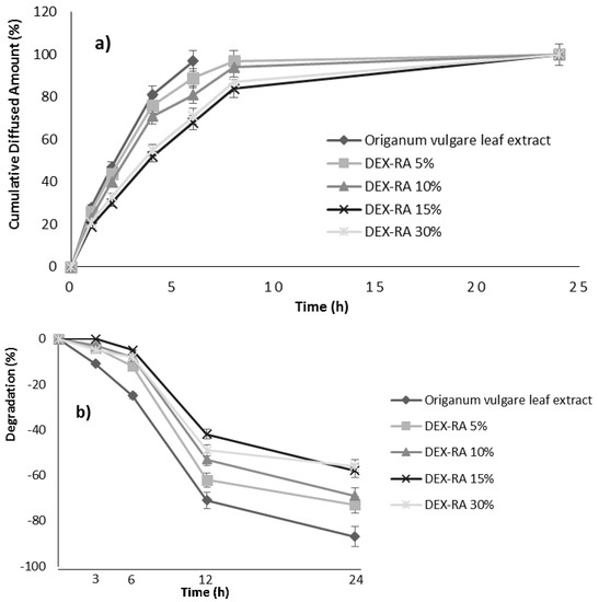 In the case of Origanum vulgare leaf extract, the diffused amount is equal to 97% within the first 6 h while, at the same time, the observed values for DEX-RA 5%, DEX-RA 10%, DEX-RA 15%, and DEX-RA 30% were 89%, 81%, 68%, and 71%, respectively.