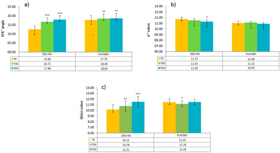 (a) ITA° values; (b) a* values related to the red component of the skin colour (skin redness) and (c) GLOSS values correlated with the ability of the skin to reflect the light (skin radiance/brightness) recorded at each experimental time for each tested formulation. Note: the asterisks above the error bars are referred to the intra-group statistical analysis (vs T0); the inter-group statistical analysis performed by means of t-test for unpaired data is reported in Table 2.