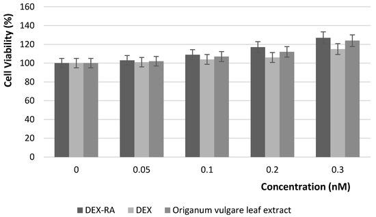 Keratinocytes were incubated in the presence of DEX-RA, a dextran aqueous solution (DEX) and Origanum vulgare leaf extract at various doses for 24 h and, as shown in Figure 4, the polymeric conjugate had any effect on cell viability at the concentrations used during this study. These data confirmed the non-cytotoxic effect of the synthesized polymeric material.