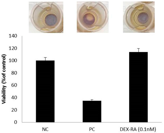 The cutaneous irritant potential of the synthesized conjugates was assessed by using the EPISKIN prediction model. For this purpose, the in vitro reconstructed human epidermis was treated with DEX-RA (0.1 nM) according to the “42 bis” procedure, which involves a 42 min exposure time followed by a rinsing step and a 42 h post-incubation period. Then, cell viability was quantify by MTT reduction and the obtained results are reported in Figure 5.