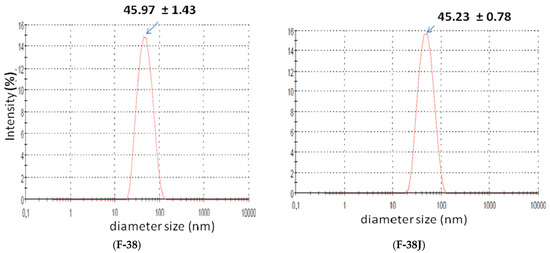 Areca, licorice and portulaca extracts were added separately at the recommended concentration in scientific literature (3.0%). Macroscopic analysis was performed, employing 24 h old nanoemulsions. Stable babassu oil nanoemulsions were obtained with 3.0% w/w vegetable extract added separately, or blended in and now designated as F-38J, with HLB value = 10.0 (sorbitan monooleate/PEG 54 castor oil added with three vegetable extracts), and were chosen for comparative studies. Figure 2 shows size distribution for both studied F-38 and F-38J nanoemulsions.