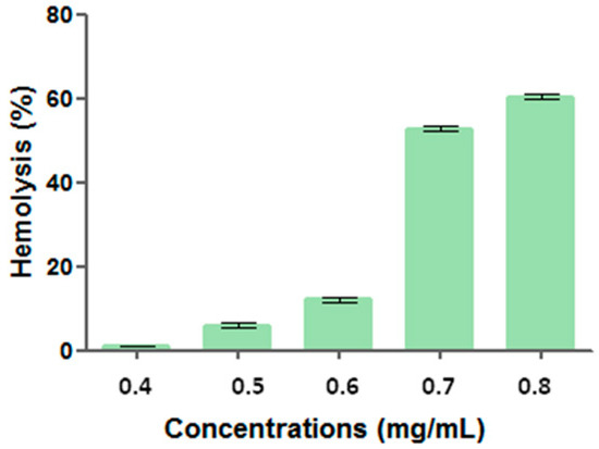 Surfactant solution containing antimicrobial preservative and BHT presented hemolytic activity from 0.40 g/mL, indicating a dose-dependent activity. For the different tested concentrations, hemolytic activity was 0.99 ± 0.12 (0.40 g/mL), 6.03 ± 0.50 (0.50 g/mL), 12.09 ± 0.52 (0.60 g/mL), 52.76 ± 0.55 (0.70 g/mL), and 60.31 ± 0.59% (0.80 g/mL) (Figure 3).