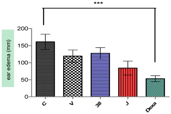 Ear edema induced by croton oil in untreated and treated animal groups. (C) Negative control; (V) vehicle; (F-38) nanoemulsion without extracts; (F-38J) nanoemulsion with extracts; (Dexa) dexamethasone solution. Values represent the mean and the respective standard deviations (n = 6–8). *** Significance level compared to the control group (C) (p < 0.001).