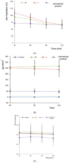 Hydration activity (A); skin oiliness (B); and skin pH evaluation (C) as a function of time. (*) no statistical differences between F38 and F38J. (*) Significance level compared to the control group (C) (p < 0.001).