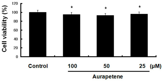 Cell viability was determined using the 3-(4,5-dimethylthiazol-2-yl)-5-diphenyltetrazolium bromide (MTT) assay. B16F10 murine melanoma cells were cultured in 24-well plates for 18 h, followed by treatment with various concentrations (25, 50, and 100 μM) of auraptene for 48 h. In brief, MTT was added to the cells and the formazan crystals were dissolved in dimethyl sulfoxide. The absorbance was measured at 540 nm. The percentage of viable cells was determined relative to the control group.