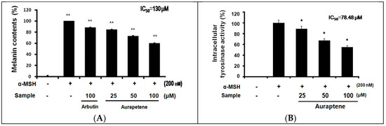To investigate the anti-melanogenic activity of auraptene, B16F10 melanoma cells were challenged with α-MSH to stimulate the production and release of melanin. As shown in Figure 2A, α-MSH-treated cells showed a marked increased the melanin content compared with untreated cells. Auraptene reduced melanin production with a half maximal inhibitory concentration (IC50) value of 130 µM, while simultaneously causing 6.2% cell death. Moreover, melanin reducing effect of auraptene was a better result than arbutin, a positive whitening agent, which exhibited 12.2% melanin reducing effect at the 100 µM (Figure 2A). The amount of melanin content is suppressed to the previous results, indicating that it is associated with the activity of the enzyme involved in melanin synthesis.