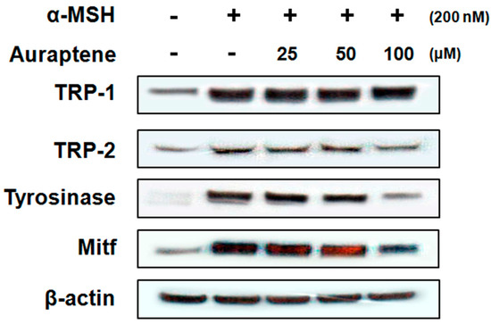 Western blotting analysis was performed to determine the expression of melanogenesis-related proteins such as tyrosinase, TRP-1, TRP-2, and microphthalmia-associated transcription factor (MITF). As shown in Figure 3, B16F10 murine melanoma cells treated with auraptene showed a significantly decreased expression of protein tyrosinase and TRP-2. However, TRP-1 protein expression was not affected. To understand the transcriptional regulation of tyrosinase and TRP-2 proteins, we investigated the effect of auraptene on the expression of MITF. Auraptene dose-dependently decreased the α-MSH-induced upregulation of MITF protein levels.
