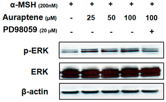 Several reports have demonstrated that ERK activation led to the phosphorylation of MITF and its subsequent ubiquitination and degradation [20]. Because auraptene was found to inhibit melanogenesis, we investigated whether the inhibitory effects were associated with ERK activation by western blotting. As shown in Figure 4, auraptene induced phosphorylation of ERK in a dose-dependent manner. Moreover, PD98059, a specific inhibitor of ERK, suppressed the phosphorylation of ERK induced by auraptene, suggesting that auraptene inhibits melanogenesis via ERK signaling pathways.