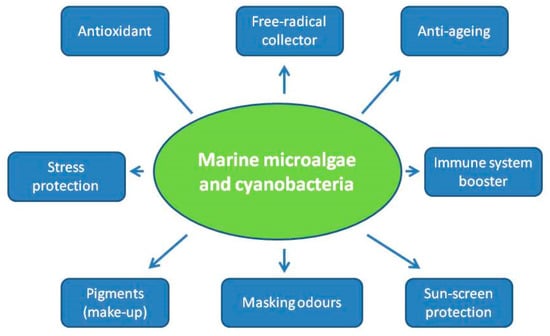 Microalgae and cyanobacteria generate components that may be of interest to the cosmetic industry (personal care products) [27]. The active ingredients extracted from certain microalgae are currently used in cosmetic and cosmeceutical products, although more research into their action mechanisms are needed.