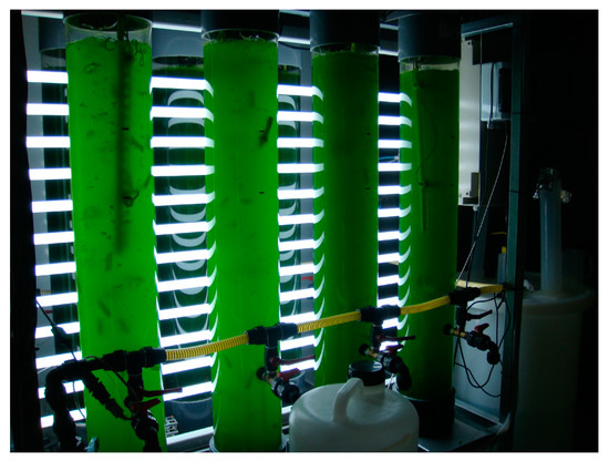 To cultivate the microalgae the marine specie Nannochloropsis gaditana was selected and cultivated in a bioreactor with temperature, pH, CO2, and air control. The conditions were set as follows: temperature between 20–23 °C, and a pH between 6.5 and 7.5. A picture of the cultivation system is shown in Figure 2.