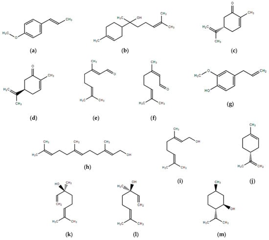 Chemical structures of most common fragrances. (a) trans Anethole; (b) α-Bisabolol; (c) S-(+)-Carvone (caraway); (d) R-(-)-Carvone (spearmint); (e) Geranial (citral A); (f) Neral (citral B); (g) Eugenol; (h) Farnesol; (i) Geraniol; (j) d-Limonene; (k) S-(+)-Linalool; (l) R-(-)-Linalool; (m) (-)-Menthol.