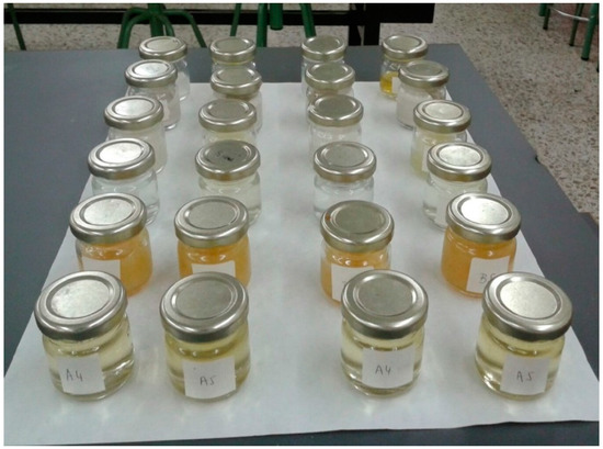 Many natural products, botanicals, or waste materials—derived from agricultural products, foods and beverages—can be used in cosmetics products [16]. Sensory test was carried out to evaluate the possibility of using natural extracts as ingredients of some cosmetic preparations and their acceptability by consumers. Independently of the antioxidant activity, the ethanolic extracts were added to provide their odoriferous characteristics to the different cosmetic formulations and to evaluate their acceptance by the consumers. Likewise, the color differed with raw material too and the volunteers scored also this difference. Personal-care products from acacia flowers extract (AFE) always showed an intense yellow color (Figure 1).