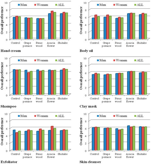 Participants from the two genres accomplished the sensory analysis (26 women and 29 men), and, as can be seen in Figure 2, no great differences between them were found. Only four samples demonstrated significant differences: women evaluated better than men the acacia flower extract when it was included in the hand cream and exfoliating preparations, and the control-exfoliating and the shampoo with grape pomace extract obtained better scores with men than with women. Female participants valued body oil and clay masks better than males, and, on the contrary, men valued the shampoo more. Hand cream elaborated with acacia flowers or shiitake attained the best scores, with 7.20 and 7.04 points, respectively.