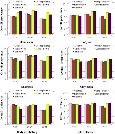 The participants were also divided into three age-segments: <20, 20–30, and 30–45 years, with 20, 19, and 16 persons, respectively. This last group perceived acacia and shiitake extracts with the significant highest values for all formulations, revealing the influence of color and odor of these natural extracts (Figure 3). In opposition, the participants under 20 years of age preferred the extracts obtained from pinus wood and grape pomace or the control sample (without any extract), except in hand cream. These two extracts received lower score in the group of older participants. Consumers in the 20–30 years old segment evaluated samples with the highest overall preference values in all personal-care products, and the preferred extracts were acacia flowers and shiitake extracts.