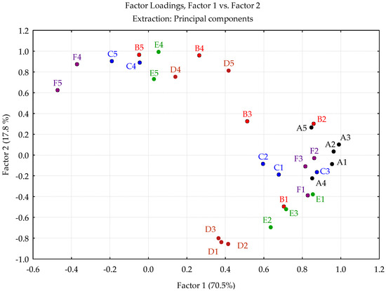 Principal component analysis bi-plot of cosmetic formulations. A–F indicate hand cream (HC), body oil (BO), shampoo (S), clay mask (CM), body exfoliating cream (BE), and a skin cleanser formulation (SC) respectively. 1–5 indicate control (without extract) grape pomace extract (GPE), pine wood extract (PWE), acacia flower extracts (AFE), and shiitake extract (SE), respectively.