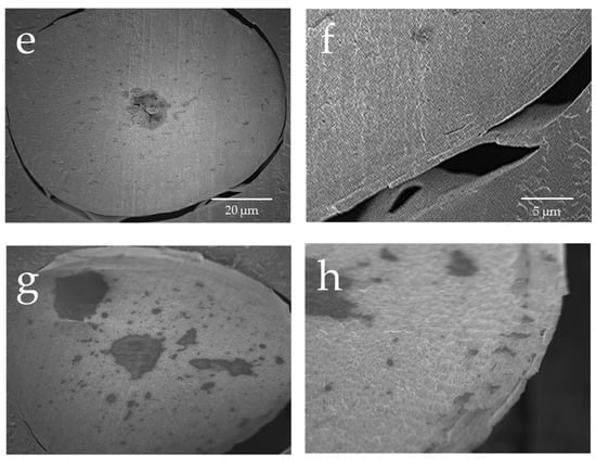Regarding the results of the observations at ×1000 (e), and ×3200 (f) for the cross-section of hair not exposed to UV radiation and the results of the observation at ×1000 (g) and ×3200 (h) of the cross-section of hair exposed to UV radiation, the cuticle was present in layers and there was no separation for the hair not exposed to UV radiation; however, for the hair exposed to UV radiation, there were voids in the cuticle layers, and vacuoles had formed in the cortex.