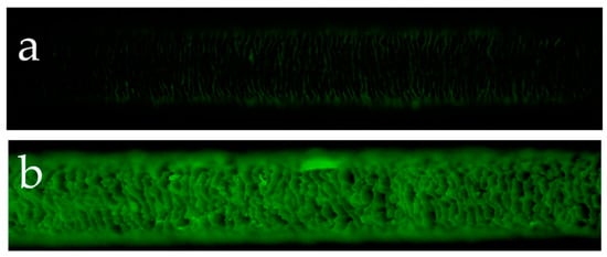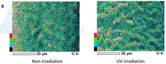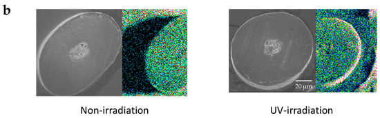 When a qualitative analysis was carried out on the surface of hair using FE-SEM-EDS, carbon, nitrogen, oxygen and sulfur were detected. Moreover, when elemental mapping was carried out, the oxygen distribution was comparatively uniform in hair not exposed to UV radiation, whereas on the surface of hair exposed to UV radiation, oxygen was detected with a skewed distribution around the cuticle layers, as shown by the arrow (Figure 7a). Similarly, on carrying out an analysis of elemental oxygen in a cross-section of human hair not exposed to UV radiation and a cross-section of human hair exposed to UV radiation, oxygen was confirmed to be localized in the cuticle layers (Figure 7b).
