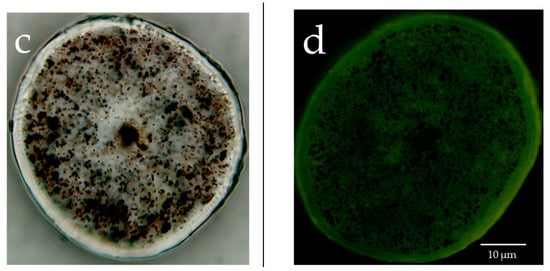 Fluorescence microscope images of fluorescence due to hydroxy radicals in human hair exposed to UV radiation and not exposed to UV radiation. Fluorescence microscope image of hydroxy radicals on the surface of hair not exposed to UV radiation (a), fluorescence microscope image of hydroxy radicals on the surface of hair exposed to UV radiation (b). Images of the cross-section of hair exposed to UV radiation. A bright-field view image of the cross-section of hair exposed to UV radiation (c), fluorescence microscope image of hydroxy radicals in the cross-section of hair exposed to UV radiation (d).