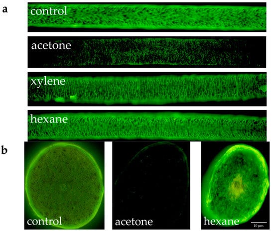 Fluorescence microscope images of fluorescence due to hydroxy radicals in the cross-section of defatted human hair not exposed or exposed to UV radiation. (a) Images of the surface of hair when human hair was defatted with acetone, xylene or hexane and exposed to UV radiation; (b) Images of the cross-section of hair when human hair was defatted with acetone or hexane and exposed to UV radiation. PBS was used as a control instead of the organic solvents used for defatting.