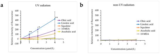 Confirmation of the production of hydroxy radicals from lipids exposed to UV radiation. The production of hydroxy radicals from oleic acid, linoleic acid, squalene, 18-methyleicosanoic acid (18-MEA) or arachidic acid exposed to UV radiation was investigated using hydroxyphenyl fluorescein (HPF) fluorescence. (a) Exposed to UV radiation, (b) not exposed to UV radiation. * p < 0.05 vs. control (0 μmol/L), ** p < 0.01 vs. control (0 μmol/L).