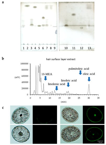 Analysis of human hair lipids and unsaturated fatty acids in the surface layer of hair. (a) TLC analysis of hair lipids extracted with acetone, hexane or xylene. Lipids in the surface layer of human hair were eluted with acetone, hexane or xylene, and these eluates were analyzed by TLC. 1, α-linolenic acid; 2, squalene; 3, oleic acid; 4, cholesteryl oleate; 5, cholesterol; 6, triolein; 7, acetone extraction of hair; 8, hexane extraction of hair; 9, control; 10, linoleic acid; 11, methyl oleate; 12, ceramide 2; 13, xylene extraction of hair. (b) high-performance liquid chromatography (HPLC) analysis of unsaturated fatty acids in the surface layer of hair extracted with acetone. The chart of the fluorescence intensity of 9-anthryldiazomethane (ADAM) alone was subtracted from the chart of the fluorescence intensity of the ADAM-derivatized acetone extract from the hair surface layer, and the results are presented in the form of a graph. (c) Localization of peroxidized lipids in the cross-section of hair exposed to UV radiation. (left) Bright-field images and images stained with Liperfluo of the cross-section of hair not exposed to UV radiation. (right) Bright-field images and images stained with Liperfluo of the cross-section of hair exposed to UV radiation.
