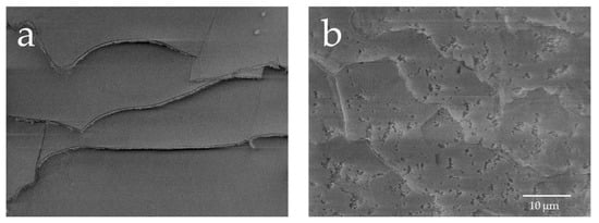 FE-SEM observations of the surface layer of human hair immersed in a Fenton reaction solution. Image of the surface of hair immersed in water and image of the surface of human hair immersed in a Fenton reaction solution. (a) Image of the surface of hair immersed in water (×2000); (b) image of the surface of hair immersed in a Fenton reaction solution (×2000).