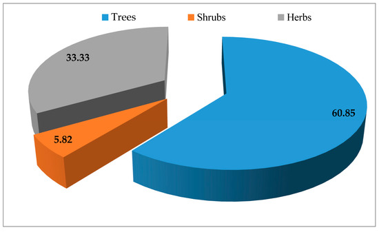 These plant species are of three botanical forms: trees, shrubs and herbs. Trees are the most abundant life forms accounting for 60.85% of all plants recorded, followed by herbs (33.33%), shrubs (5.82%) (Figure 2).