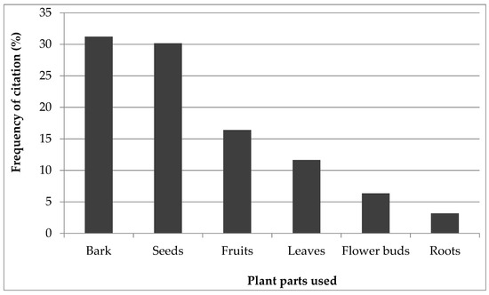 Different parts of the plant species recorded are used as cosmetics including bark (31.2%), seeds (30.1%), fruits (16.4%), leaves (11.6%), flower buds (6.3%) and root (3.1%). The barks and seeds were the most frequently used plant parts (Figure 3).