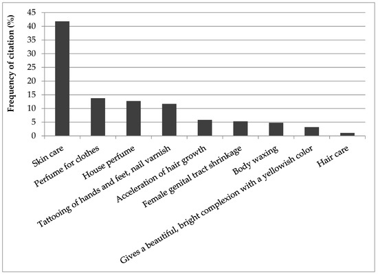 A great majority of recorded plants are used for skin care (42% of citations), perfume (27%) and for tattooing (11% of citations). Preparations for hair care were the least frequent use of recorded plants (Figure 4).