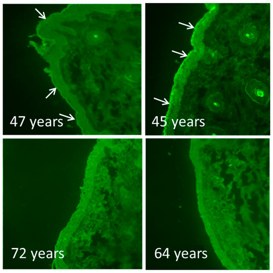 The epidermal calcium gradient in female human eyelids. The calcium distribution was stained using the calcium-specific dye Calcium-GreenTM in cryosections of two old (birth year 1949 and 1953) and two middle-aged females (birth year 1969 and 1971). In the middle-aged skin sections, a peak of calcium in the stratum granulosum is clearly visible (indicated with white arrows), whereas the calcium is equally distributed in the aged skin sections.