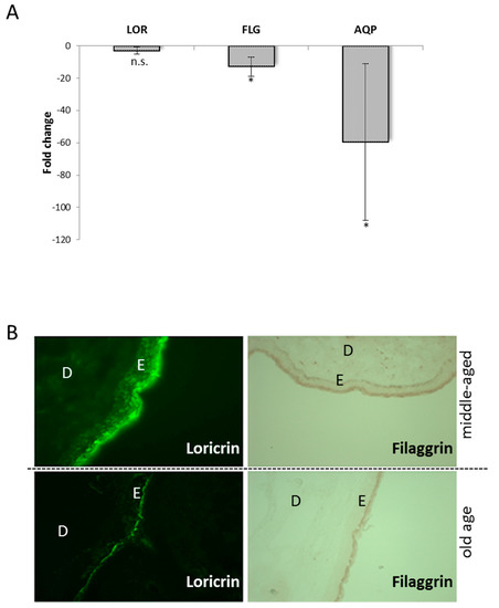 In a previous publication with male skin tissues, a direct consequence of this calcium redistribution was a changed composition of the cornified envelope. To confirm these changes in female tissues, two observed phenotypes of aged foreskin samples were chosen due to their importance to the skin: a drop of filaggrin and a drop of loricrin. Especially the reduced levels of filaggrin have a backlash on skin hydration and therefore a third marker was chosen: AQP3. This protein is the most important aquaglyceroporin of the epidermis and is contributing to skin hydration and proliferation and differentiation of keratinocytes [12]. As can be seen in Figure 2A, the RNA levels of all three genes are dropping with increased age as shown by RT-PCR analysis: Loricrin RNA levels are 3-fold reduced, filaggrin levels (p-value: 0.043) are more than 12-fold reduced, and AQP3 (p-value: 0.059) levels show a nearly 60-fold reduction.