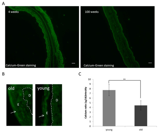 In the next step, we wanted to test if the breakdown of the epidermal calcium gradient is not a specific marker for aged human skin, but is a universal hallmark of aged mammal skin. Therefore, an alteration in the calcium homeostasis and its feedback on the cornified envelope was tested in the important model organism mus musculus. As the most promising skin region of the mouse body, the external ear-shell was chosen. In this skin area, hair bulbs are completely absent and a certain similarity to human skin is obvious. Analogous to human skin, the epidermal calcium gradient was analyzed on skin sections by using the calcium specific dye Calcium GreenTM-1-AM. In total, 12 skin samples were analyzed (6 skin samples were obtained from young mice (~4 weeks old) and 6 from aged mice (~100 weeks). In concordance to human skin we could also detected a calcium gradient in mice epidermis with a peak in the stratum granulosum and very low concentrations in the stratum basale (Figure 3A). Another phenotype is also very apparent: In mice skin, the epidermis is significantly thinner compared to human epidermis and this fact increases the difficulty to analyze the calcium gradient. Surprisingly, this calcium gradient did not completely collapse during aging but was less steep. Especially noticeable was the fact that the calcium concentration dramatically increased in the stratum basale in 100 weeks old mice. To quantify this age-dependent change in the epidermal calcium gradient, the decrease of the Calcium-GreenTM fluorescence in the stratum garnulosum) the software ImageJ was used. By using this software, the ratio between the fluorescence intensity of the inner layers (stratum basale and spinosum) and the outer layers (stratum granulosum and corneum) was determined. In young mice, the fluorescence intensity of the stratum granulosum is 8-fold higher than in the stratum basale, and in old mice this ratio is almost reduced by 50%.