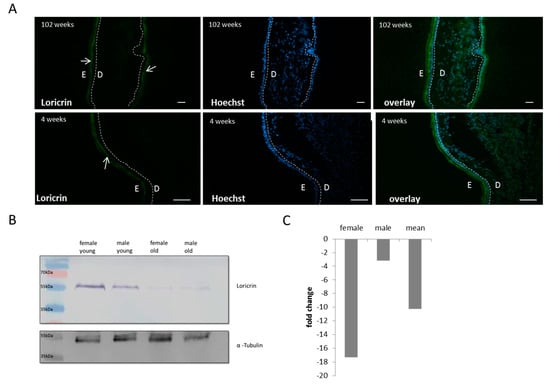 Thereafter, we wanted to test if these reduced levels of calcium in the stratum granulsoum lead to a changed composition of the cornified envelope. As the marker protein for this potential change, loricrin was chosen. Similar to humans, loricrin is the most abundant protein of the cornified envelope in mice (~70% by mass). In contrast to humans, where changes in loricrin levels or mutations lead to severe diseases such as Vohwinkel’s disease or progressive symmetric erythrokeratoderma (PSEK) [13,14], a loss of loricrin has a very mild phenotype in mice [15]. On histological skin sections, immunohistochemistry revealed that loricrin resides in the stratum garnulosum/corneum (Figure 4A). Loricrin was stained with a specific primary antibody and was visualized with an Alexa 488-conjugated secondary antibody. When comparing young and old mouse skin sections, the amounts of loricrin are clearly reduced, although the phenotype is less prominent than in human aging. The phenotype is much more obvious with Western blot analysis comparing young female, young male, old female, and old male epidermal protein extracts. The loricrin levels are slightly varying between the sexes, but a clear decline of loricrin could be seen in the ~100-weeks-old mice (Figure 4B). The drop of loricrin was quantified using ImageJ and a ~10-fold reduced level of loricrin was found in aged mice (Figure 4C).