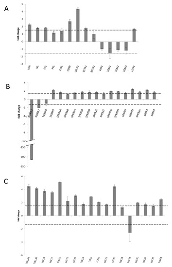Positive values indicate an upregulation of genes during the ageing process, negative values indicate a downregulation. The dotted lines represent the chosen cut-off value for a significant fold change of 1.5. (A) shows the regulation of most prominent cornified envelope genes (loricirn, envoplakin, involucrin, loricrin, filaggrin, and the transglutminases). (B) includes all members of the small proline rich repeat family and some S100 proteins. In (C), the regulation of all members of the late cornified envelop protein family can be found. The p-values of this analysis are summarized in Table 2.