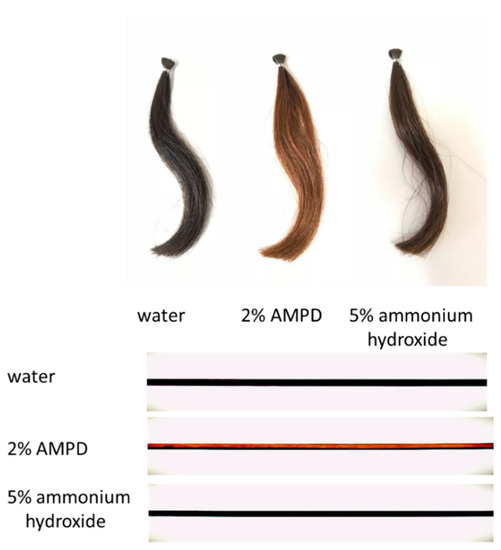 Images of human hair bleached with H2O2 and 2% AMPD aqueous solution and human hair bleached with H2O2 and 5% ammonium hydroxide. The experimental conditions are described in Section 2.2. (Above) Images taken with a digital camera of same person’s hairs; (Below) images taken with an optical microscope. Top: human hair bundle immersed in pure water (control); middle: human hair bundle bleached with H2O2 and AMPD aqueous solution; bottom: human hair bundle bleached with H2O2 and ammonium hydroxide.