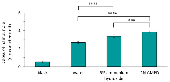 Comparison of the gloss measurements of a human hair bundle immersed in pure water (control), a human hair bundle bleached with H2O2 and 5% ammonium hydroxide, and a human hair bundle bleached with H2O2 and 2% AMPD aqueous solution. The results are expressed as the mean ± standard deviation of five experiments. *** p < 0.001, **** p < 0.0001.