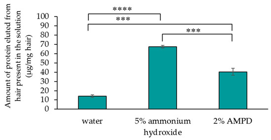 Determination of quantities of protein lost from human hair after using 5% ammonium hydroxide or 2% AMPD aqueous solution as an alkaline agent. The results are expressed as the mean ± standard deviation of three experiments. *** p < 0.001, **** p < 0.0001.