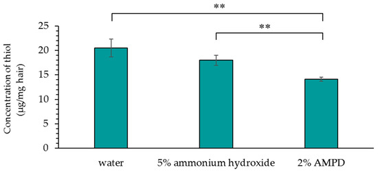 The concentration of thiol groups (−SH) produced by cleavage of disulfide bonds in human hair after using 5% ammonium hydroxide or 2% AMPD aqueous solution as an alkaline agent. The results are expressed as the mean ± standard deviation of three experiments. ** p < 0.01 vs. ammonium hydroxide.