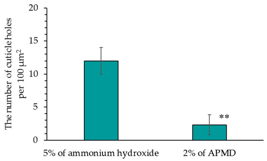 Comparison of the number of cuticle holes in FE-SEM images (×10,000). The results are expressed as the mean ± standard deviation of three experiments. ** p < 0.01 vs. ammonium hydroxide.