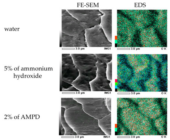 The results of EDS-mediated oxygen mapping in human hair after using AMPD aqueous solution or ammonium hydroxide as an alkaline agent are shown in Figure 9. When human hair was immersed in pure water, oxygen atoms were segregated around the surface cuticle layer. The oxygen atoms on the surface of the hair bleached using AMPD aqueous solution were present over the entire cuticle, whereas when ammonium hydroxide was used, the oxygen atoms were localized at the cuticle edge.