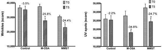 As what regards UV spots, significant differences were found in the time factor between averages of UV spots (Figure 1). Specifically, the contrasts indicated significant differences on the G2 group between T0 and T5 and between T3 and T5. Among the users in group G3, the results showed significant differences between all the times, i.e., both M-OSA and MMST provided improvement on UV spots and on wrinkles.
