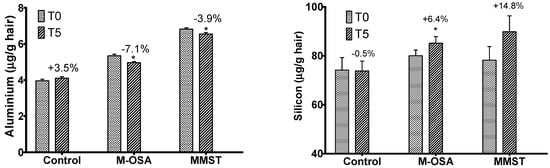 Significative results from hair mineral analysis, as a function of time in the groups. Elements determined as µg per g of hair. * Statistically significant difference from T0. M-OSA = maltodextrin-stabilized ortoshilic acid. MMST = treated with monomethylsilanetriol. T0 = baseline. T5 = 5 months of study.