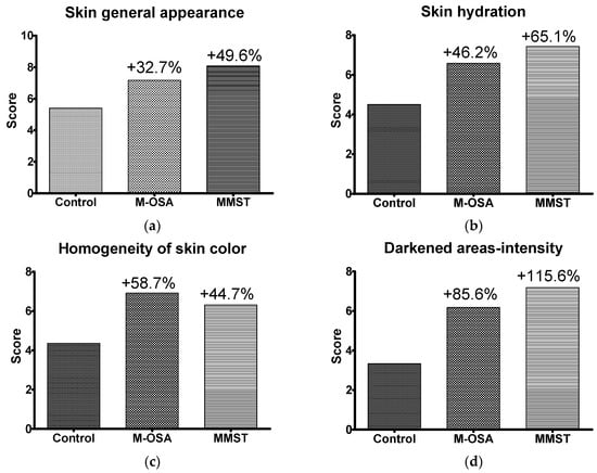 In order to evaluate the homogeneity of the sample, the three groups were compared at T0. For the dermatological parameters and hair mineral analysis (Tables S1 and S2), in the majority of the evaluated items, the groups did not present at the beginning of the study any statistically significant differences (although it seems to occur in a first look, without statistical analysis). However, in the evaluation of left pore size, users of MMST and M-OSA differed significantly (p = 0.029); Significant differences (p = 0.045) were also observed for the Truskin® test (left); specifically, the difference was observed between the MMST and M-OSA groups. As groups were not homogeneous at baseline, so this was considered during statistical analysis.