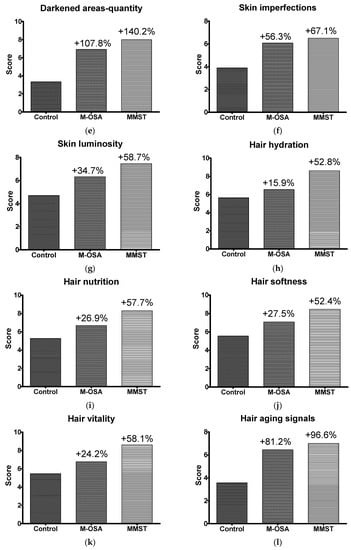 With concerns to our results, together with the proven effects directly related to Si consumption, skin texture and eyelashes length also changed throughout the study for all groups. These effects can be attributable to the role that Si plays on collagen synthesis (it stimulates type I collagen synthesis), on enzyme activation and cross-linking in connective tissues, and on the increase of elastic fibers density [7,9,21]. The reduction of collagen, proteoglycans and glycosaminoglycans, as well as the degradation of elastic fibers, are key factors on the skin aging, which can be observed as sagging. In addition to that, Si also was shown to provide important connections among hyaluronic acid, proteoglycans and water [38]. All of these data are strong points that corroborates the findings of our study on the betterment of facial skin parameters. What also corroborates the analytical results is the patients’ self-reported satisfaction with the treatment, in scale of 1–10. Comparison between control x treatments showed a higher number of parameters well evaluated for the ones who used MMST instead of M-OSA. But in a general manner both treatments were able to provide satisfaction in the volunteers in hair, nail and skin parameters.